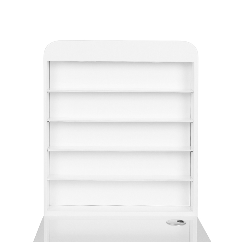 Biurko kosmetyczne z pochłaniaczem – bardzo funkcjonalny mebel do salonów kosmetycznych który łączy w sobie trzy funkcje: biurko, pochłaniacz pyłów oraz regał do ekspozycji lakierów itp. Mebel idealnie komponujący się z wyposażeniem nowocześnie urządzonych pomieszczeń. Posiada szafkę z pojemnymi szufladami. Mebel został specjalnie zaprojektowany w taki sposób aby maksymalnie ułatwić pracę oraz zmniejszyć problem wystających kabli ( od lampek, frezarek, pochłaniaczy itp. ) :