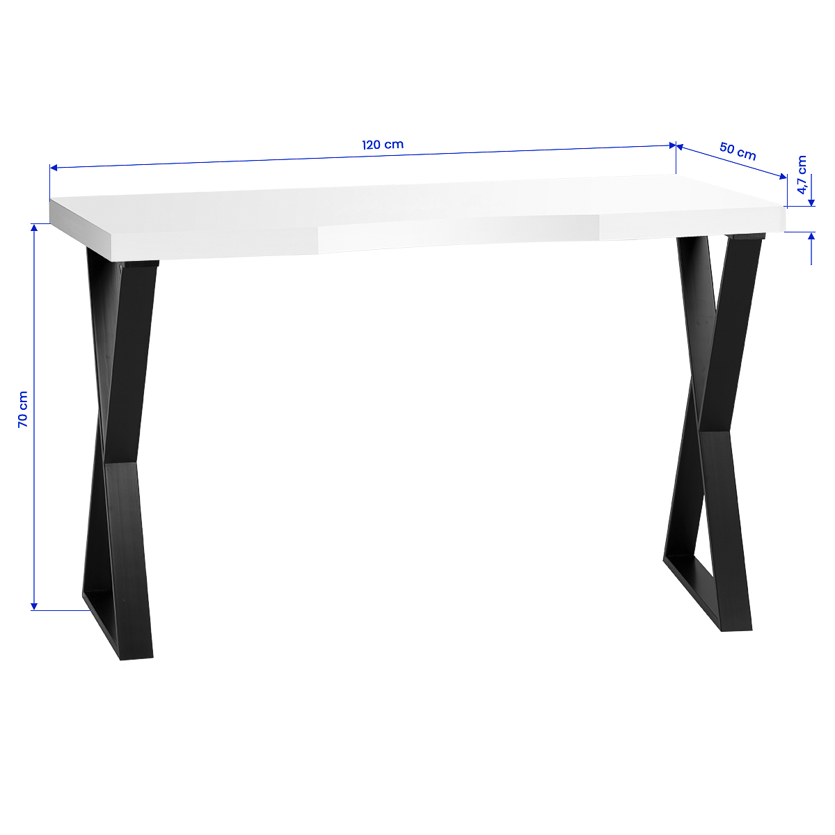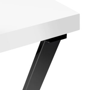Biały blat na wysoki połysk oraz geometryczne, czarne nogi nadają mu lekkości i nowoczesnego charakteru. Dzięki swojej lekkiej formie biurko sprawdzi się zarówno w kameralnych, jak i przestronnych wnętrzach, podkreślając ich ekskluzywny charakter. To doskonała inwestycja w estetykę oraz komfort codziennej pracy.