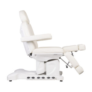 Wyjątkowy fotel kosmetyczny elektryczny idealnie nadający się do gabinetów kosmetycznych oraz salonów SPA. Dzięki niezależnym siłownikom umożliwia regulację fotela w 3 płaszczyznach płaszczyznach za pomocą pilota i przełaczników nożnych dając możliwość komfortowego przeprowadzenia zabiegów pedicure oraz na twarz i ciało. Używając pilota możemy korzystać z zaprogramowanych ustawień oraz uruchamiać funkcję HOT czyli podgrzewanie. W fotelu została zastosowana tapicerka perforowana niespotykana w innych fotelach oraz kolorowe podswietlenie LED podstawy.