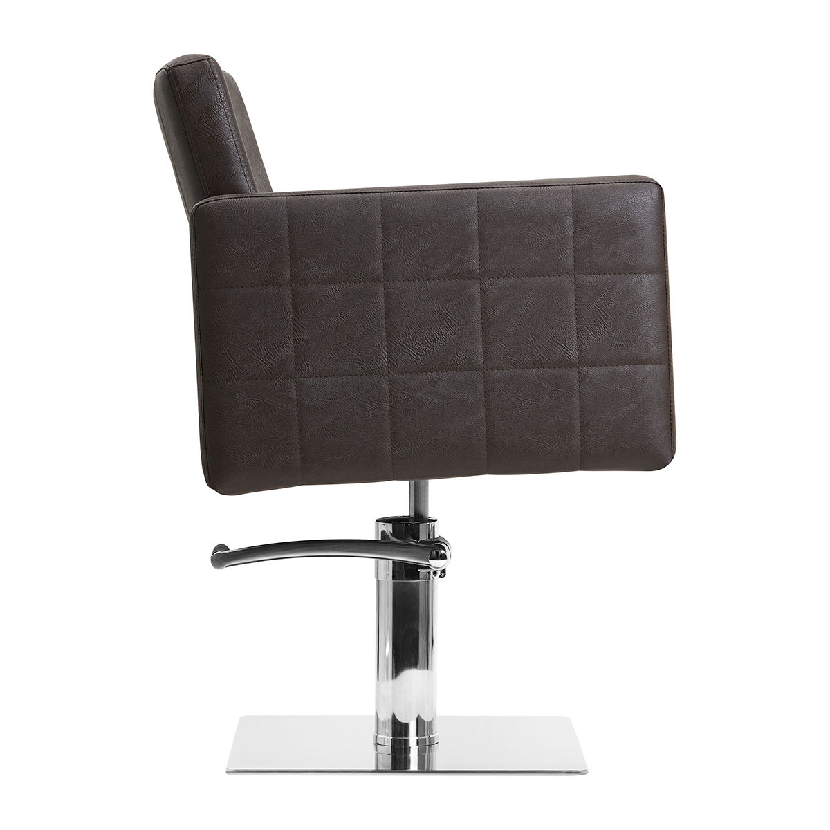 Wygodny fotel wypełniony jest trwałą i odporną na odkształcenia pianką, co zapewnia wieloletnie użytkowanie, wysoki komfort oraz wygodę nawet podczas wielogodzinnych zabiegów. Obicie wykonane jest z przyjemnej w dotyku skóry syntetycznej, a zastosowanie takiego materiału sprawia, że sprzęt jest odporny na wilgoć, wytrzymały oraz bardzo łatwy w czyszczeniu. Pokrycie w odcieniach brązu wraz z ciekawymi wizualnie elementami nadają mu wyjątkowego charakteru. Sprzęt wyróżnia elegancki design, który sprawia, że fotel będzie doskonale prezentować się w wielu wnętrzach salonów fryzjerskich.