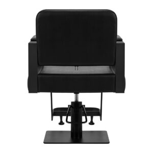 Regulacja wysokości możliwa jest dzięki zastosowaniu trwałego podnośnika hydraulicznego, który pozwala dostosować poziom siedziska w granicach 50-64 cm – nawet w momencie, gdy klient siedzi na fotelu. Gwarantuje to bardziej ergonomiczną pracę, zapewniając możliwość dopasowania poziomu siedziska do wzrostu zarówno klienta, jak i fryzjera. Oparcie obite jest skórą syntetyczną i pozwala na zajęcie dogodnej pozycji, zapewniając doskonałe wsparcie dla pleców, co ma znaczenie zwłaszcza w przypadku wielogodzinnych zabiegów. Dużym plusem tego modelu jest pozostawiony pomiędzy oparciem a siedziskiem otwór. Ułatwia on zachowanie czystości w salonie, pozwalając w łatwy sposób wymieść włosy z każdego zakamarka fotela. W ten sposób można usprawnić przygotowanie stanowiska pracy pomiędzy klientami.