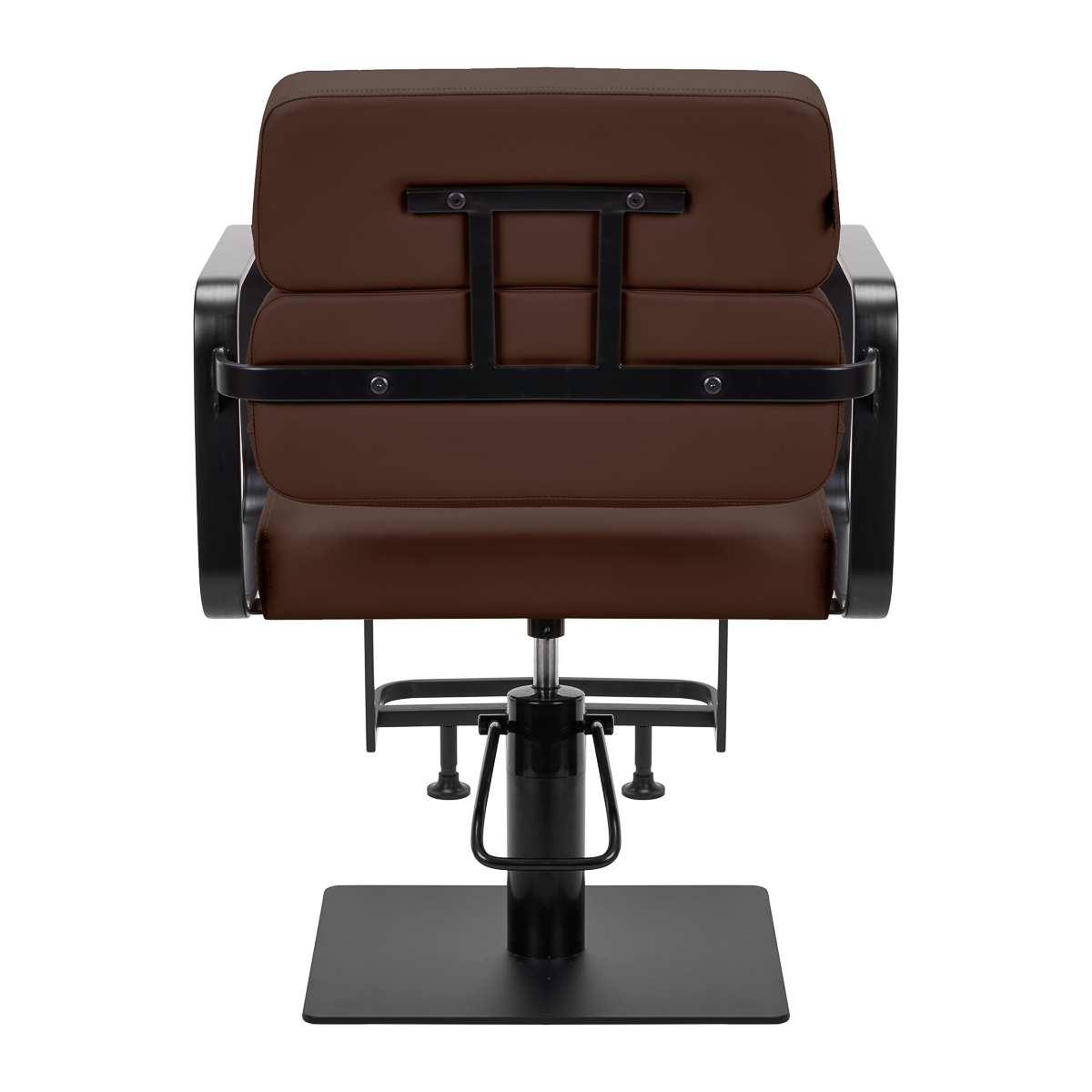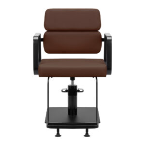 Mechanizm pełnego obrotu, w który jest wyposażony fotel, sprawia, że praca fryzjera staje się bardziej efektywna i wygodna. Solidna, płaska podstawa w kształcie kwadratu gwarantuje stabilność w trakcie użytkowania. Matowo wykończona, gładka powierzchnia nadaje elementowi elegancki wygląd i sprawia, że ten jest łatwy do utrzymania w czystości. Wygodne siedzisko z wypełnieniem z pianki zapewnia wysoki komfort użytkowania, nawet podczas wielogodzinnych zabiegów. Geometryczne, metalowe podłokietniki pozwalają na prawidłowe ułożenie barków klienta – sprawia to, że nie chowa głowy w ramionach ani się nie garbi – co wyraźnie ułatwia wykonywanie precyzyjnych zabiegów, w tym strzyżenia. Dedykowany do tego modelu stylowy podnóżek zapewnia stabilne oparcie dla stóp użytkownika.