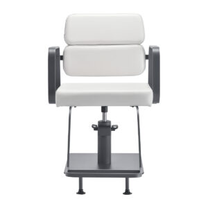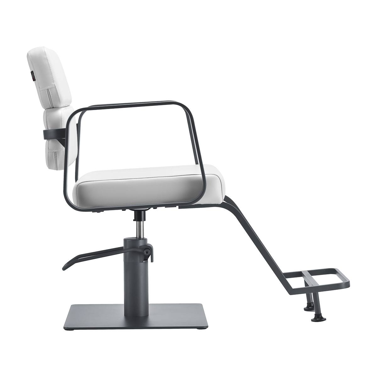 Mechanizm pełnego obrotu, w który jest wyposażony fotel, sprawia, że praca fryzjera staje się bardziej efektywna i wygodna. Solidna, płaska podstawa w kształcie kwadratu gwarantuje stabilność w trakcie użytkowania. Matowo wykończona, gładka powierzchnia nadaje elementowi elegancki wygląd i sprawia, że ten jest łatwy do utrzymania w czystości. Wygodne siedzisko z wypełnieniem z pianki zapewnia wysoki komfort użytkowania, nawet podczas wielogodzinnych zabiegów. Geometryczne, metalowe podłokietniki pozwalają na prawidłowe ułożenie barków klienta – sprawia to, że nie chowa głowy w ramionach ani się nie garbi – co wyraźnie ułatwia wykonywanie precyzyjnych zabiegów, w tym strzyżenia. Dedykowany do tego modelu stylowy podnóżek zapewnia stabilne oparcie dla stóp użytkownika.