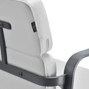 Trwały podnośnik hydrauliczny pozwala dostosować poziom siedziska w granicach 49-61 cm – nawet w momencie, gdy klient siedzi na fotelu. Zapewnia bardziej ergonomiczną pracę, umożliwiając dopasowanie poziomu siedziska do wzrostu zarówno klienta, jak i fryzjera. Ciekawe wizualnie oparcie pozwala na zajęcie dogodnej pozycji, zapewniając doskonałe wsparcie pleców, co ma znaczenie zwłaszcza w przypadku wielogodzinnych zabiegów. Dużym plusem tego modelu jest otwór pozostawiony pomiędzy oparciem a siedziskiem. Ułatwia on zachowanie czystości w salonie, pozwalając w łatwy sposób wymieść włosy z każdego zakamarka fotela. Pozwala to usprawnić przygotowanie stanowiska pracy pomiędzy klientami.