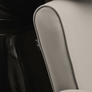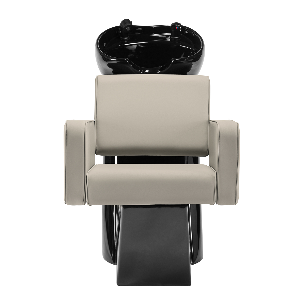 Fotel o geometrycznej formie z miękko zaokrąglonymi krawędziami łączy prostotę i wygodę w nowoczesnym wydaniu. Kwadratowe siedzisko i podłokietniki o łagodnych kątach tworzą harmonijną całość, gwarantując komfortową pozycję podczas zabiegów. Oparcie o optymalnym kącie nachylenia wspiera prawidłową postawę, pozwalając na pełen relaks. Tapicerka z wysokiej jakości skóry syntetycznej w odcieniach szarości i beżu jest odporna na zużycie i łatwa do utrzymania w czystości. Geometryczna, nowoczesna forma mebla podkreśla elegancki charakter myjni oraz spójnie komponuje się z aranżacją salonu. W zestawie znajduje się kompletna armatura o matowym wykończeniu w odcieniach czerni, w tym bateria, słuchawka prysznicowa oraz dedykowane węże, aby zapewnić całkowity zestaw narzędzi do pracy.