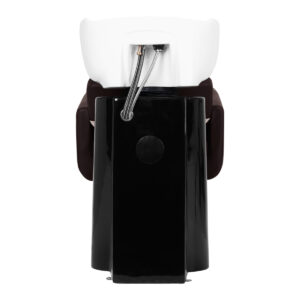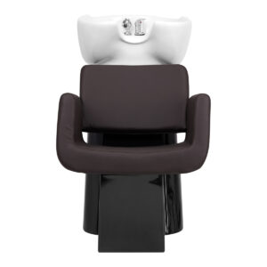 Profesjonalna myjka fryzjerska -stabilna, niezwykle wygodna, solidnie wykonana. Nowoczeny design czyni z niej piękne dopełnienie wyposażenia nowoczesnego salonu fryzjerskiego. Siedzisko wykonane z wysokiej jakości brązowej ekoskóry. Silikonowa podkładka pod głowę stabilizuje głowę klienta i pozwala na jej wygodne ułożenie na myjce. Misa myki w kolorze białym, z możliwości regulacji swojego nachylenia. Myjnia w kolorze czarno-brązowo-białym.