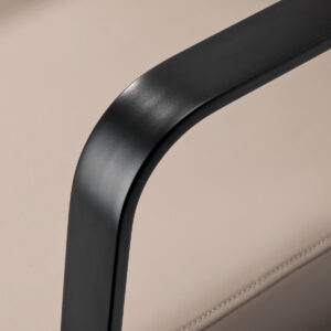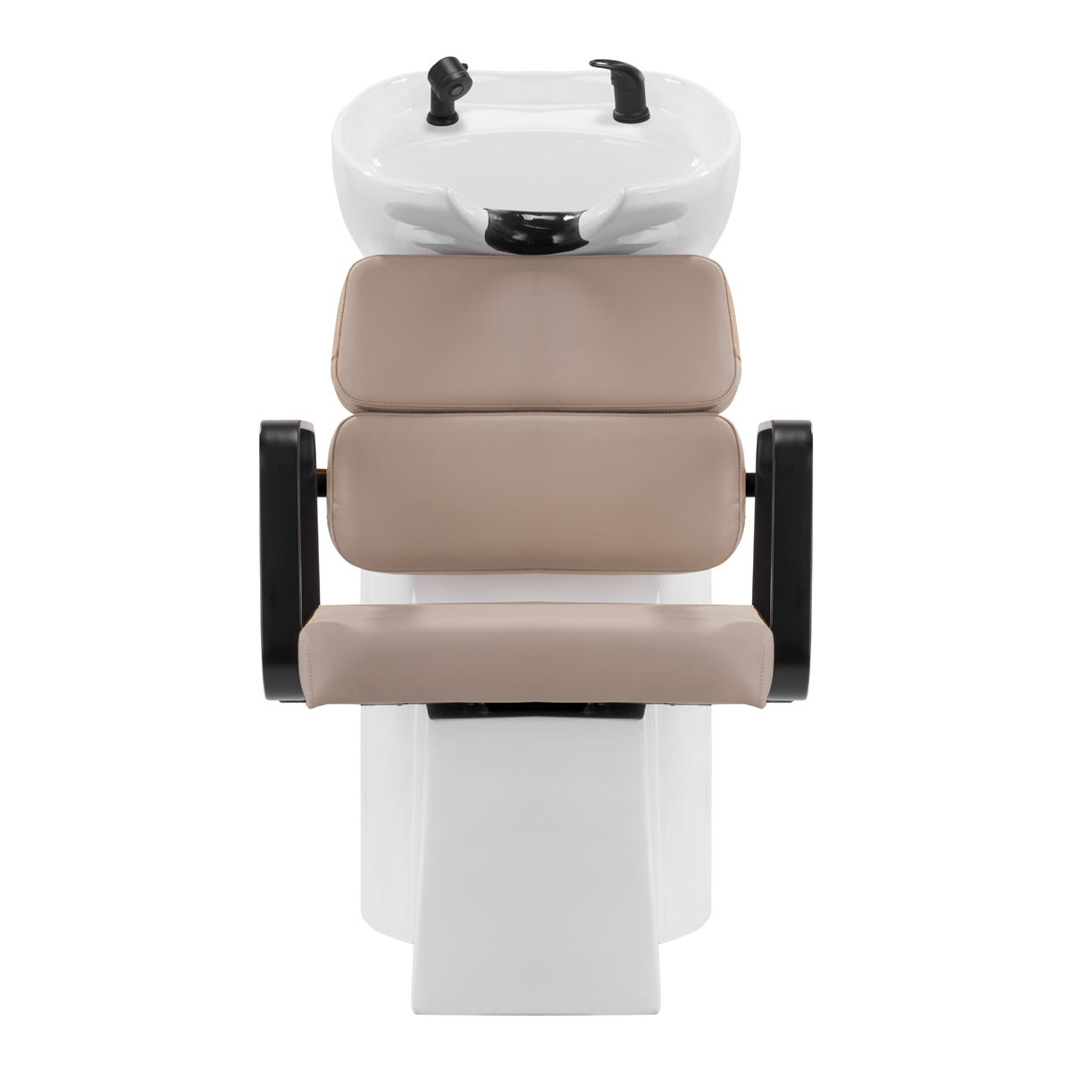 Wyprofilowany fotel zapewnia odpowiednie wsparcie lędźwi, a co za tym idzie wysoki komfort użytkowania. Metalowe podłokietniki w odcieniach czerni o geometrycznym kształcie pozwalają na prawidłowe ułożenie barków klienta. Wypełnienie z trwałej, odpornej na odkształcenia pianki oraz obicie wykonane z przyjemnej w dotyku skóry syntetycznej w odcieniach beżu zapewniają trwałość mebla, łatwość czyszczenia i komfortowe użytkowanie przez długi czas. Oryginalny, elegancki wygląd myjni nadaje wnętrzom niepowtarzalnego wyrazu. W zestawie znajduje się kompletna armatura w odcieniach czerni, w tym bateria, słuchawka prysznicowa oraz dedykowane węże, aby zapewnić kompletny zestaw narzędzi do pracy.