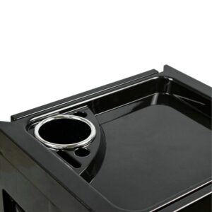 Pomocnik fryzjerski dwustronny w kolorze czarnym, posiada 5 kuwet i schowki na asortyment fryzjerski. Stablina konstrukcja zapewni długotrwałe użytkowanie. Stolik osadzony na kółkach, dzięki którym narzędzia będą zawsze pod ręką.