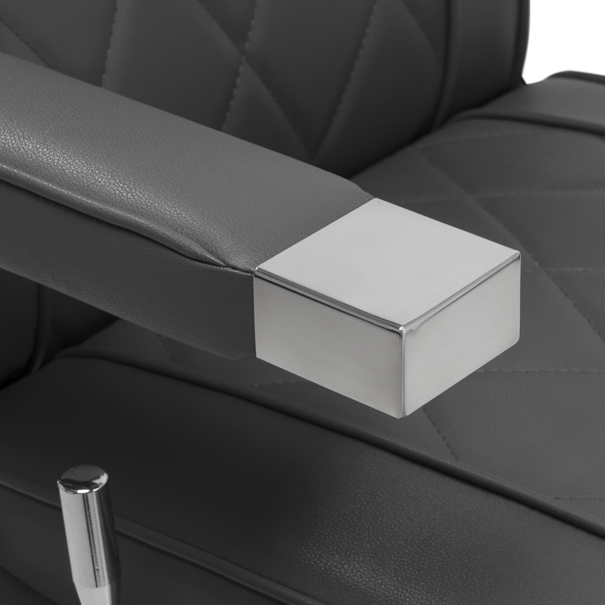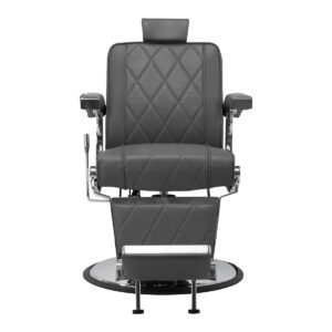 Solidna konstrukcja okrągłej podstawy zapewnia stabilność oraz wysoki komfort użytkowania. Wypełnienie siedziska z odpornej na odkształcenia pianki oraz obicie wykonane z przyjemnej w dotyku skóry syntetycznej o matowym wykończeniu zapewniają trwałość mebla oraz jego komfortowe użytkowanie przez długi czas. Stylowe przeszycia na tapicerce nadają fotelowi charakteru, przywodząc na myśl design motoryzacyjny, co podkreśla jego elegancki wygląd. Sprawiają również, że sprzęt jest odporny na wilgoć, wytrzymały oraz łatwy do czyszczenia. Pokrycie w odcieniach szarości nadaje mu wyjątkowego charakteru, a minimalistyczny styl pozwala mu wpasować się w wystrój każdego salonu barberskiego.