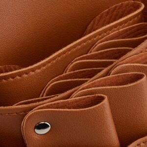 Kabura została wykonana ze skóry ekologicznej i jest w kolorze brązowym. Zamontowana w niej została piękna blaszka, która zawiera kamień szlachetny. Idealna do przechowywania narzędzi fryzjerskich podczas pracy. Używanie jej znacząco ułatwi twoją pracę, ponieważ każde narzędzie będziesz mieć pod ręką.