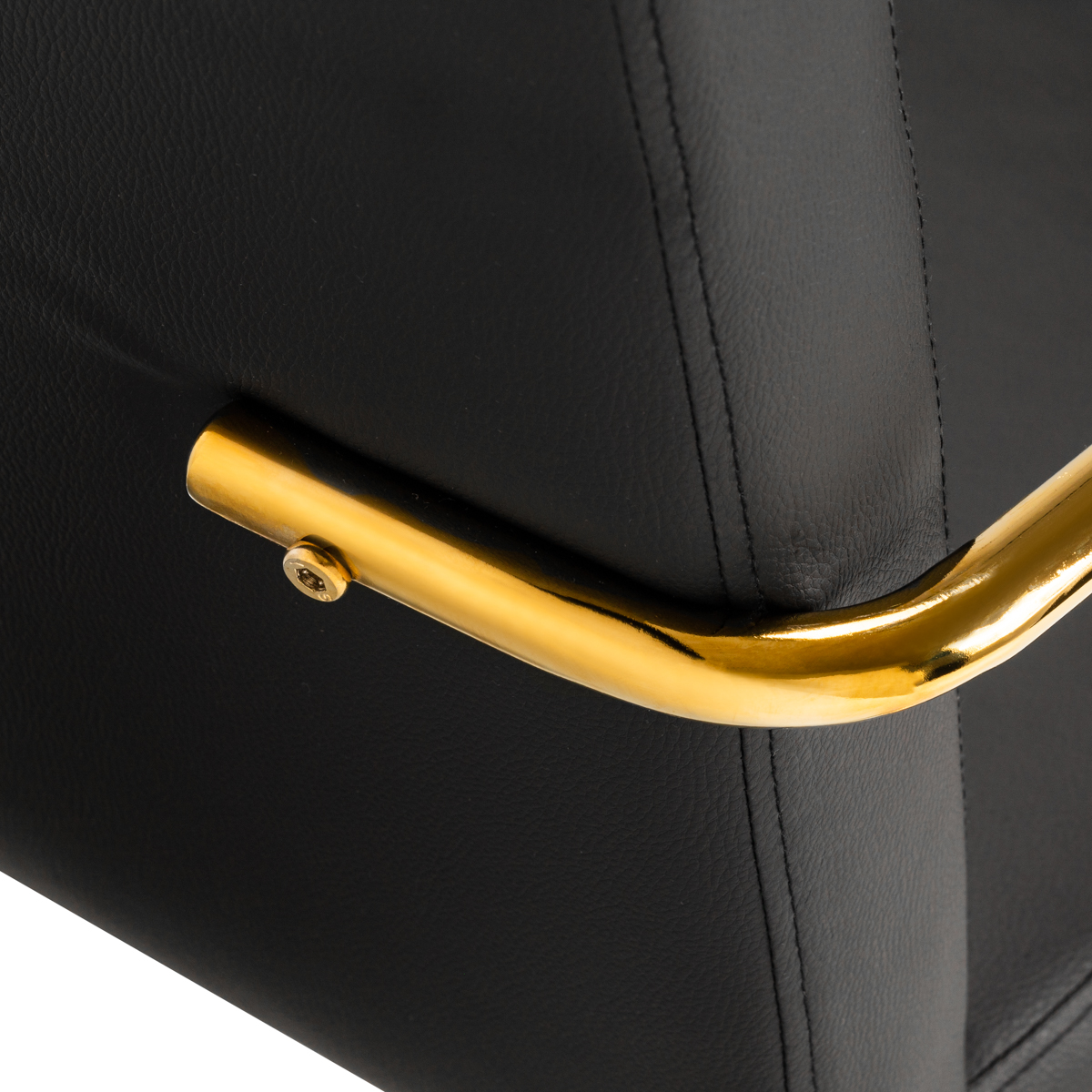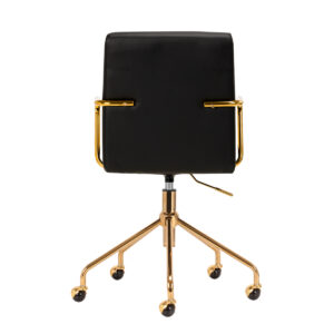 Przyjemne w dotyku, obicie ze skóry syntetycznej w odcieniach czerni nadaje meblowi wyjątkowego charakteru. Eleganckie wykończenie sprawia, że mebel przykuwa wzrok. Stelaż w odcieniach złota dodaje elegancji, idealnie komponując się z prostymi kształtami. Funkcjonalne kółka zapewniają znaczną mobilność, ułatwiając przestawianie krzesła oraz poruszanie się po salonie w trakcie pracy. Estetyka wykonania, komfort użytkowania oraz ergonomicznie wyprofilowane oparcie sprawiają, że krzesło spełni wymagania nawet najbardziej wymagających użytkowników.