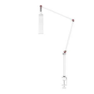 Prosta forma statywu w klasycznym odcieniu bielisprawa, że lampa będzie świetnie wyglądać niemal w każdym wnętrzu. Matowe wykończenie i czerwone elementy na łączeniach nadają jej elegancki wygląd. Swobodny montaż do blatu możliwy jest dzięki działającemu na zasadzie imadła uchwytowi, którego maksymalne rozwarcie wynosi 6 cm – będzie odpowiedni do większości blatów.