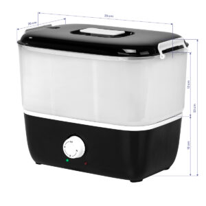 Model wyróżnia się szybkim nagrzewaniem, po chwili osiągając swoją maksymalną temperaturę, co sprawia, że jest idealnym wyborem dla profesjonalistów, przyspieszając pracę. Timer pozwala na ustawienie czasu nagrzewania na 10, 20 lub 30 minut, a po jego upływie urządzenie automatycznie się wyłącza, zapewniając bezpieczeństwo. Podgrzewacz jest podzielony na trzy przestrzenie, co pozwala na efektywne wykorzystanie miejsca i pomieszczenie wielu ręczników. Lampki kontrolne LED oraz oznaczenia minimalnego i maksymalnego poziomu napełnienia zapewniają wygodę i bezpieczeństwo użytkowania.