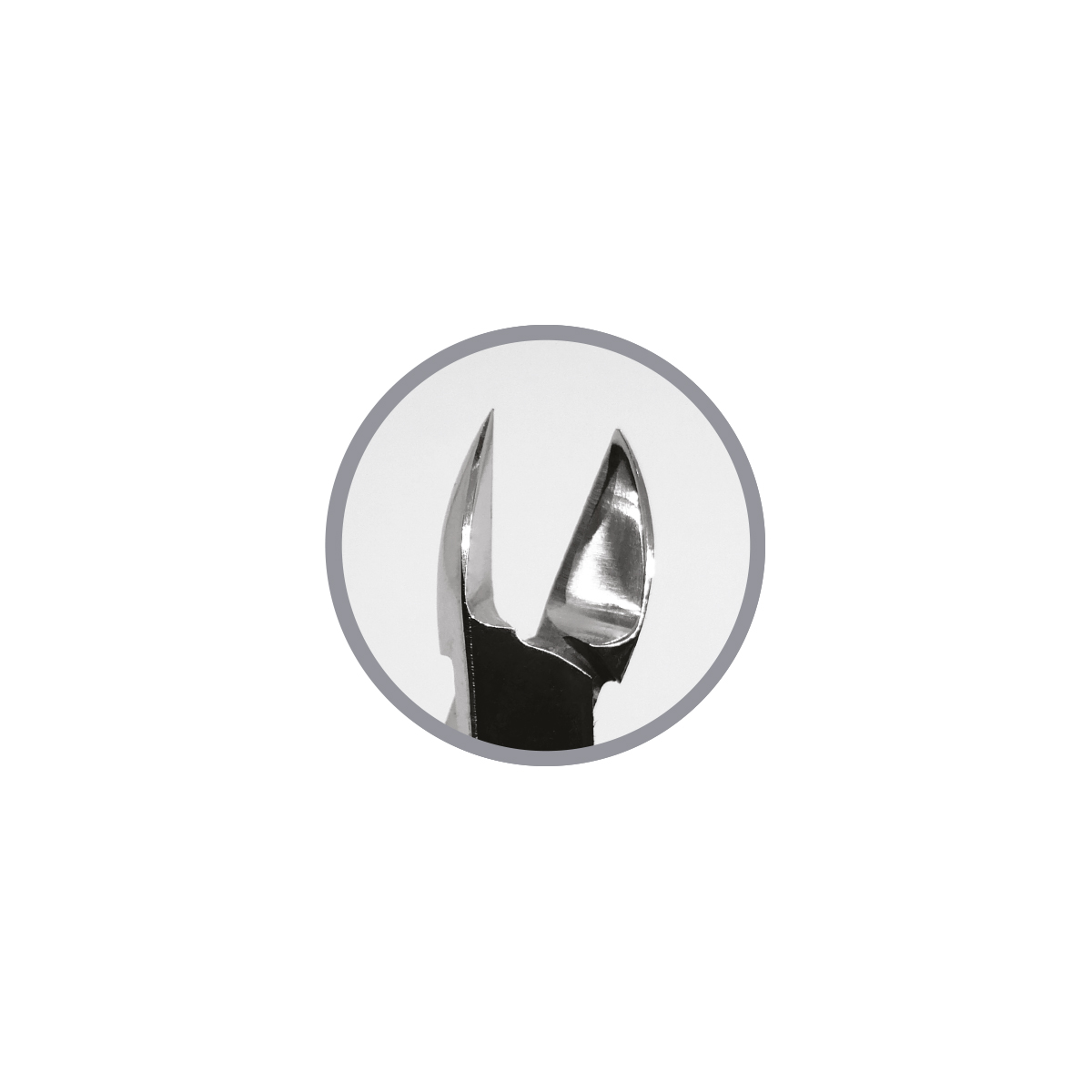 Bardzo stabilnie leżą w dłoni, co powoduje, że praca staje się bardziej komfortowa i bezpieczna. Dodatkowym atutem jest nieostry czubek, dzięki któremu cęgi nadają się do domowego użytku. Można używać ich do skracania paznokci u dzieci i pacjentów z grup ryzyka. Sprawdzają się zarówno w gabinecie, jak i w odsprzedaży. Posiadają mechanizm dwusprężynowy, zabezpieczony. Sprzedawane w puszce, która chroni w trakcie transportu.