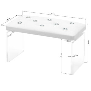 Odpowiednia wysokość podpórki zapewnia wygodną pozycję zarówno dla klienta, jak i dla stylistki. Poprawna postawa stylistki minimalizuje obciążenie kręgosłupa, skutecznie redukując ból pleców, a klientce zapewnia to większy komfort i relaks. Silikonowe elementy na nóżkach chronią blat przed zarysowaniami i zapobiegają przesuwaniu się na stole, gwarantują stabilność. Stelaż z tworzywa sztucznego i elegancki welur zapewniają długą trwałość produktu, a ozdobne kryształki nadają mu wyjątkowy wygląd.
