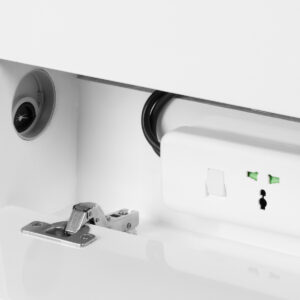 Wysokiej jakości pomocnik podologiczny to funkcjonalny mebel kosmetyczny na kółkach. Dzięki swojej mobilności możesz transportować go do innych pomieszczeń zabiegowych. Pomocnik posiada szklany blat roboczy, szuflady na narzędzia, akcesoria oraz półkę na frezarkę podologiczną lub inne urządzenie. Jedna szuflada posiada wbudowaną lampę UV-C dla zachowania lepszej sterylności narzędzi i akcesoriów.