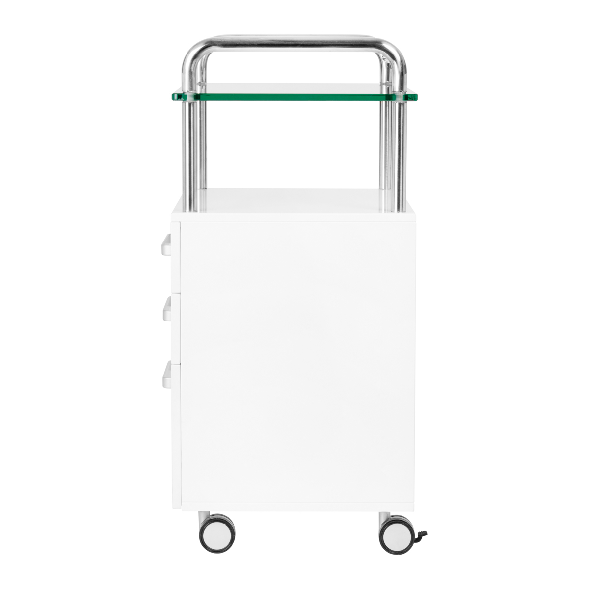 Wysokiej jakości pomocnik podologiczny to funkcjonalny mebel kosmetyczny na kółkach. Dzięki swojej mobilności możesz transportować go do innych pomieszczeń zabiegowych. Pomocnik posiada szklany blat roboczy, trzy szuflady na narzędzia, akcesoria oraz półkę na frezarkę podologiczną lub inne urządzenie.