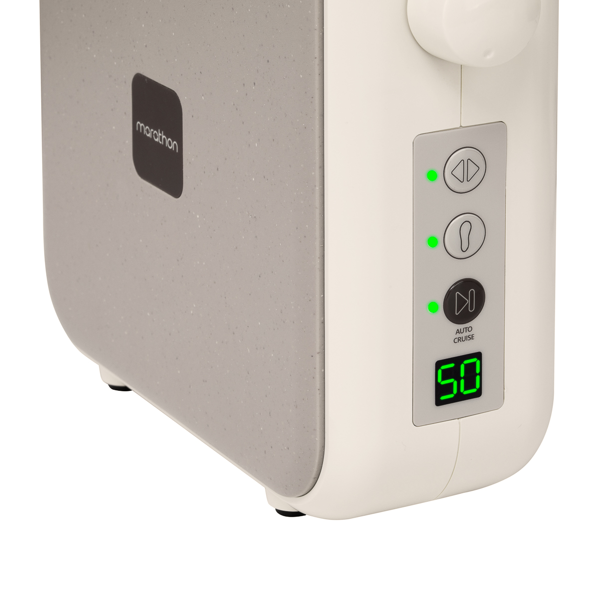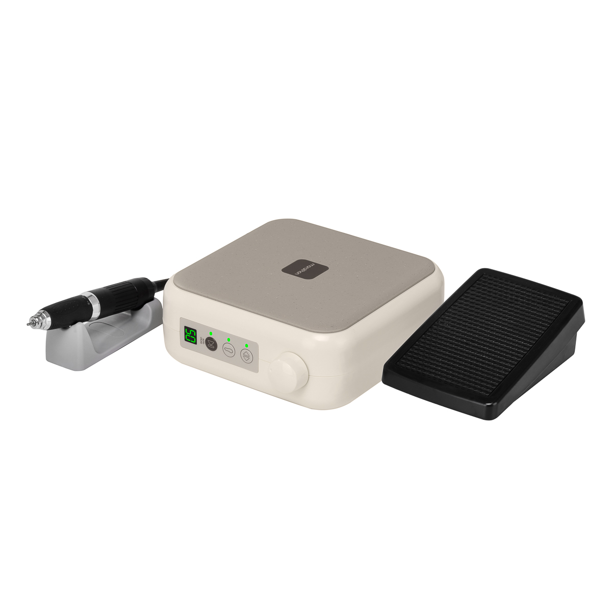 Przy użyciu pokrętła można regulować prędkość pracy głowicy do 50 000 obrotów na minutę, a aktualną prędkość wyświetla cyfrowy ekran. Pozwala na sprawne dostosowanie do indywidualnych potrzeb, a co za tym idzie komfortowe wykonywanie szerokiej gamy zabiegów. Prędkość wyświetla się na wyświetlaczu cyfrowym. Przyciski umożliwiają szybkie przełączanie na napęd nożny, zmianę kierunku obrotów oraz zatrzymanie pracy urządzenia (funkcja pauzy), co zapewnia pełną kontrolę nad frezarką i ułatwia dostosowanie jej działania do wykonywanych usług. Kontrolki LED informują o stanie urządzenia, wskazując kierunek obrotów, aktywację napędu nożnego, włączenie funkcji tempomatu oraz pauzy. Obsługa sprzętu jest prosta, efektywna i intuicyjna, co z pewnością docenią również bardziej wymagający użytkownicy.