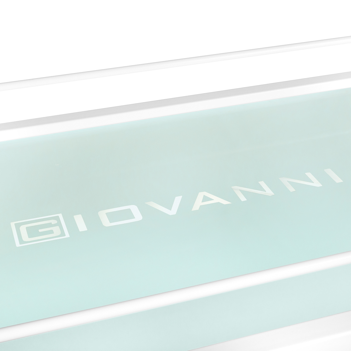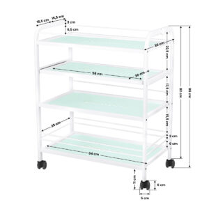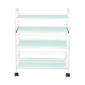 Estetyczny stolik pod urządzenie kosmetyczne, metalowo-szklany, z kółkami. Posiada cztery szklane półki z wygrawerowanym logo GIOVANNI.