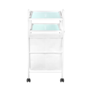 Funkcjonalny metalowo-szklany stolik na gumowych kółkach. Stolik posiada cztery szklane półki z grawerowanym logo firmy GIOVANNI. Dodatkowym atutem stolika jest przymocowany do niego worek na brudne ręczniki i opaski kosmetyczne.