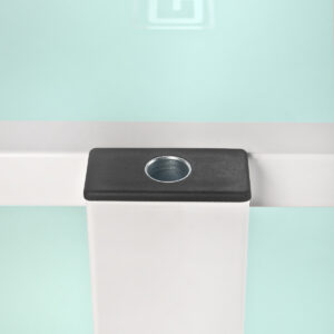Stabilny, metalowo-szklany stolik z gumowanymi kółkami.