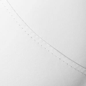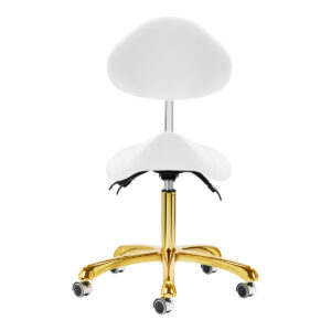 Pięcioramienna, odpowiednio zaprojektowana podstawa w odcieniach złota sprawia, że taboret jest stabilny, nawet podczas intensywnej pracy. Kółka zapewniają znaczną mobilność, co ułatwia przemieszczanie mebla po gabinecie. Obicie wytrzymałego taboretu wykonano z imitacji skóry w odcieniach bieli. Dzięki użyciu takiego materiału taboret jest odporny na wilgoć i łatwy w czyszczeniu.
