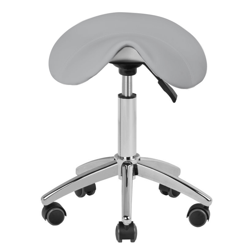 Wygodny, stabilny taboret kosmetyczny bez oparcia, z profilowanym siedziskiem, na pięcioramiennej podstawie z gumowanymi kółkami,