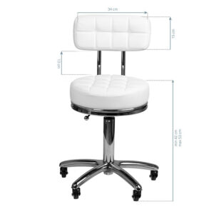 Taboret kosmetyczny w kolorze białym z pikowanym siedziskiem i wygodnym oparciem. Posiada regulację wysokości i pęcioramienną podstawę wyposażoną jest w solidne metalowo-gumowe kółka.