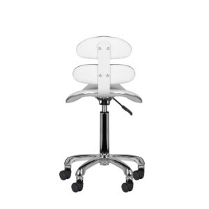 Wygodny, stabilny taboret kosmetyczny z profilowanym siedziskiem i ergonomicznym oparciem. Osadzony na pięcioramiennej podstawie z rewelacyjnymi plastikowymi Roll Speed, które gwarantują lekkośc w przemieszczaniu się. Wykonany z eko-skóry w kolorze białym.