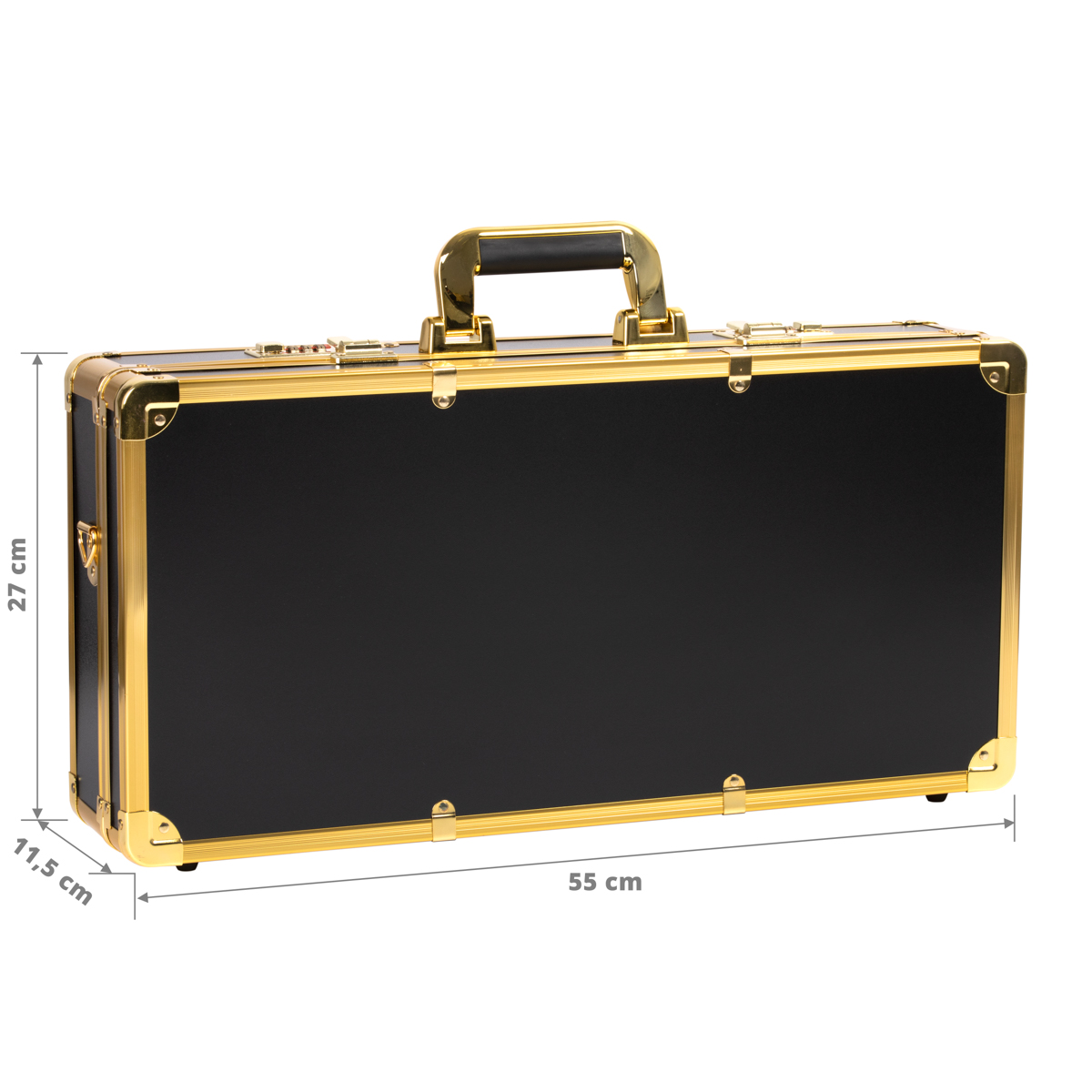 Aluminiowa walizka fryzjerska z podwójnym zamkiem szyfrowym i wygodnym uchwytem. Powierzchnie metalowe lakierowane. Walizka pomieści różne akcesoria i narzędzia fryzjerskie – nożyczki, grzebienie, szczotki do włosów, suszarkę, maszynki do strzyżenia itp. Do walizki dołączony jest odpinany pasek na ramię.